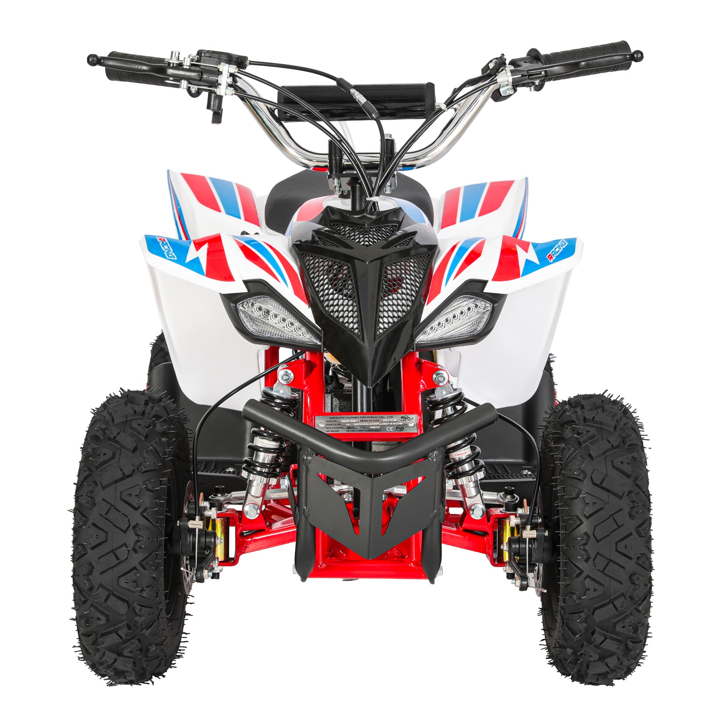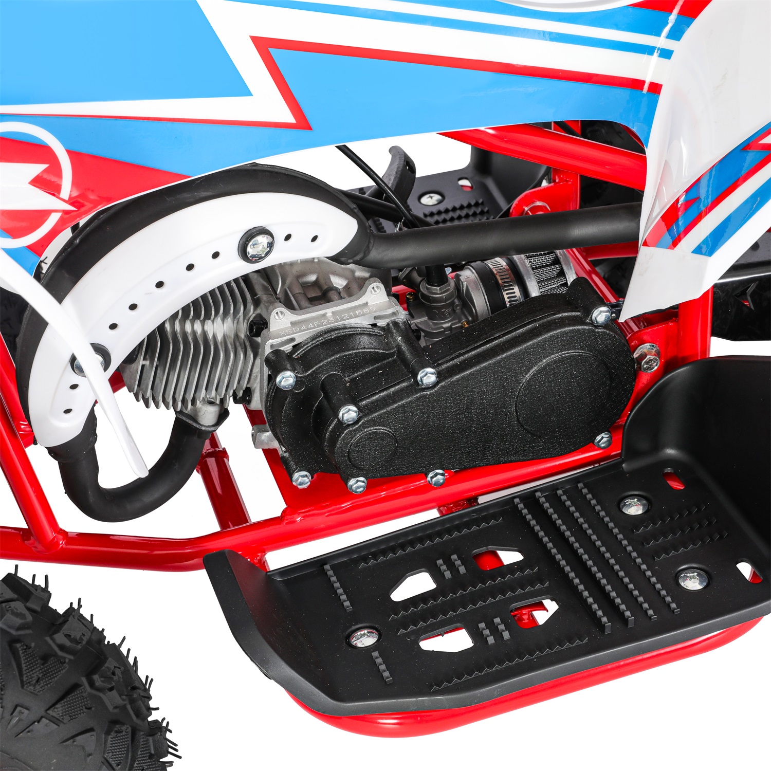 Wie Sie auf dem Bild sehen können, ist dieses 49cc ATV Mini Quad schwarze Kunststoffabdeckung mit bunten Aufkleber, mit einem vorderen und einem hinteren Regal, geeignet für Strände, Gras, Bergstraßen, touristischen Sehenswürdigkeiten und anderen komplexen Straßen.